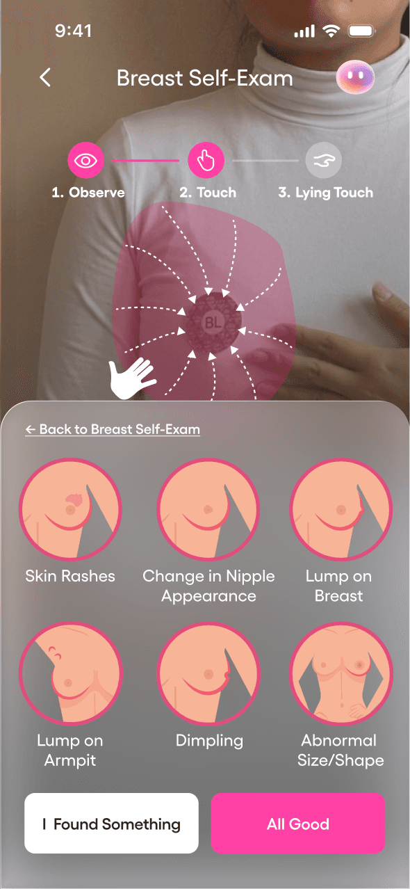 Master your self-exam with real-time AR that maps clinical techniques directly onto your body, turning guesswork into expert-guided confidence.